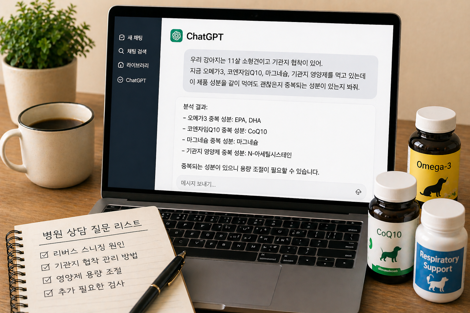 가장 큰 장점은 시간 절약이었습니다. 예전에는 영양제 하나를 고르기 위해 후기와 성분표를 2시간 이상 비교하는 날도 있었습니다. 지금은 ChatGPT와 10분 정도 대화하며 기준을 먼저 정리한 뒤, 병원 상담 때 물어볼 질문까지 미리 준비하는 방식으로 바뀌었습니다. 또한 막연한 불안감 때문에 검색만 반복하는 시간을 줄여 준다는 점도 만족스러웠습니다. 보호자가 혼자 고민하던 시간을 줄이고 판단 순서를 정리할 수 있다는 점에서도 도움이 되었습니다.